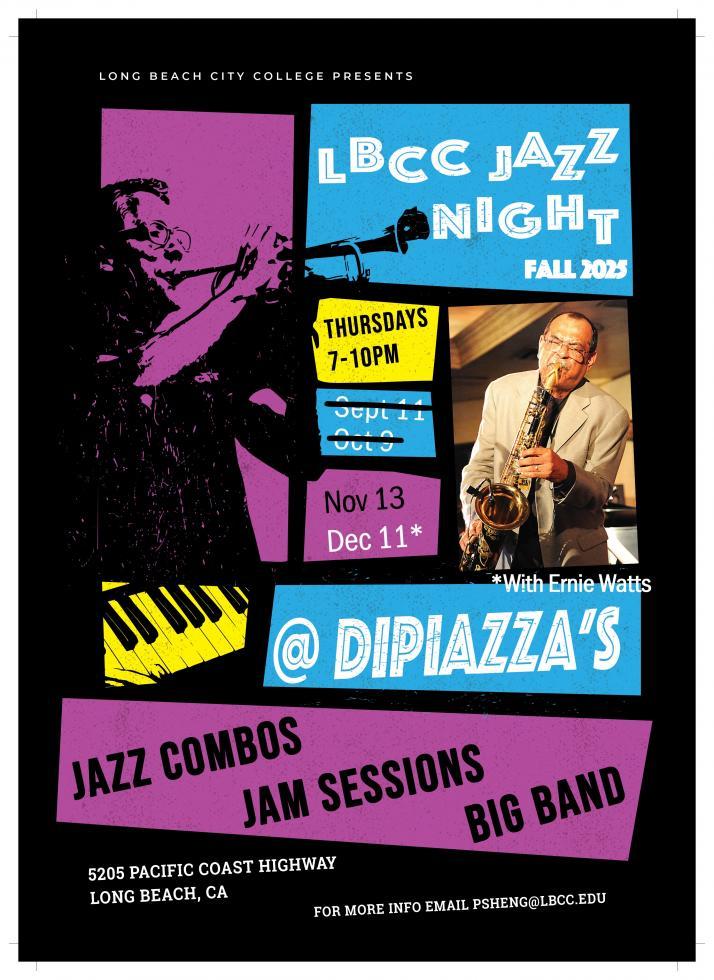 Don’t miss an exciting night of live jazz at DiPiazza’s. The LBCC Jazz Combos will perform from 7:00–9:00 PM, followed by the LBCC Big Band from 9:00–10:00 PM. This showcase highlights outstanding student musicians and features a full evening of jazz performance.