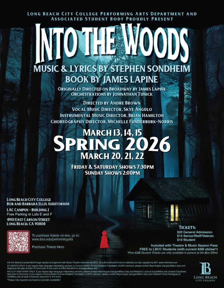 Step into a world of wishes, magic, and adventure as the LBCC Performing Arts Department presents Into the Woods this spring. Featuring music and lyrics by Stephen Sondheim, this enchanting musical will be performed March 13–15 and March 20–22 at the Bob and Barbara Ellis Auditorium (LAC). Evening shows begin at 7:30 p.m., with Sunday matinees at 2:00 p.m. Tickets are available at www.lbcc.edu/performingarts, and LBCC students attend free with a current ASB sticker.