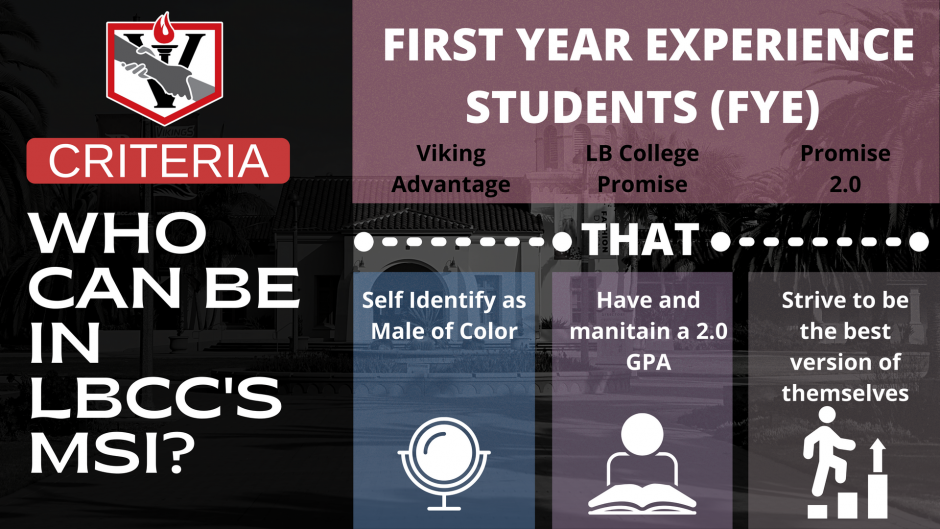 LBCC’s Male Success Initiative (MSI) is designed to address the unique needs and challenges of men of color (MOC) by connecting them to existing services, bolstering a sense of belonging and identity, and mentoring opportunities. Our mission is to inspire MOC to dream while empowering them to act so that demography (race, socio-economic status, zip code) is no longer destiny. Navigate Onward to Brotherhood, Leadership, and Excellence…Be an MSI NOBLE Scholar!